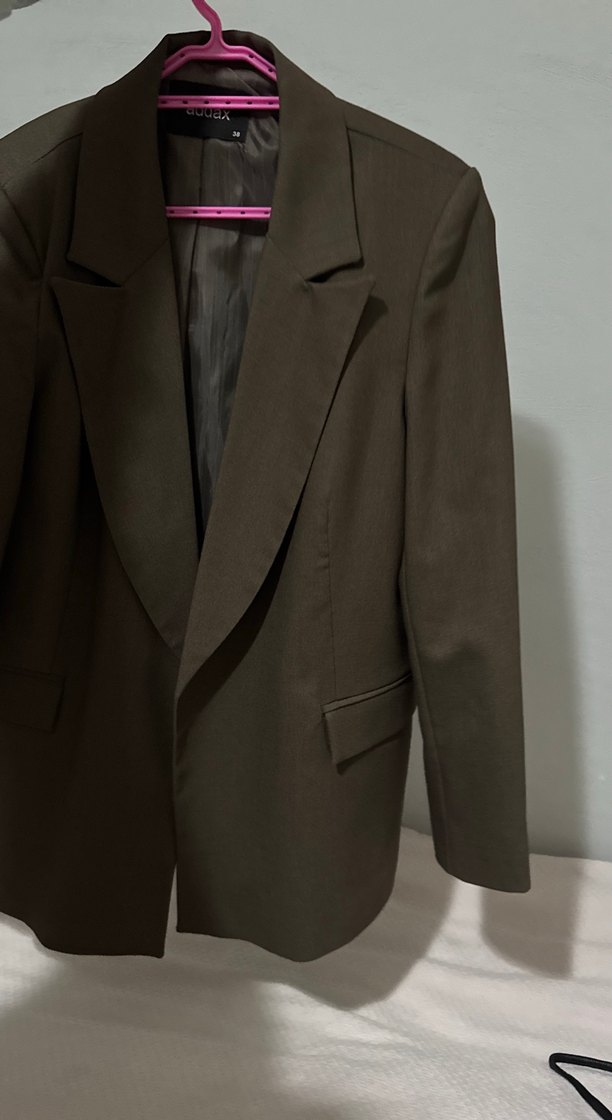 Kahverengi kadın blazeri, yakalı ve düğmeli, sentetik kumaştan, regular fit ve askılı kollu, ofis kullanımı için uygundur.