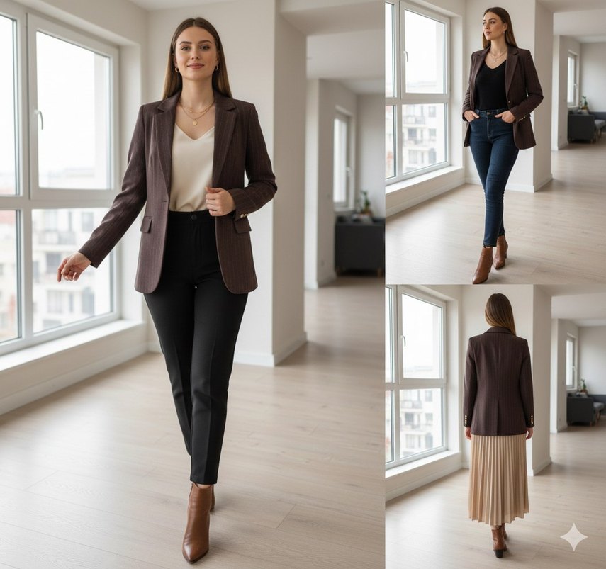Kahverengi kadın blazer, yakalı ve uzun kollu, düz ve şık tasarımıyla ofis için ideal. Orta boy ve rahat kesimlidir, modern bir görünüm sunar. Göğüs: 89 Cm. Bel:87 Cm. Boy: 71 Cm. Kol Boy: 56 Cm. Kendi etiket kartımla gelicektir