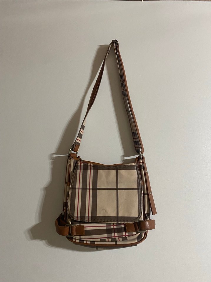 Kahverengi deri, kare desenli kadın omuz çantası, günlük kullanım için uygundur. Gri ve bej tonlarında, bohem ve sokak stilini yansıtır.