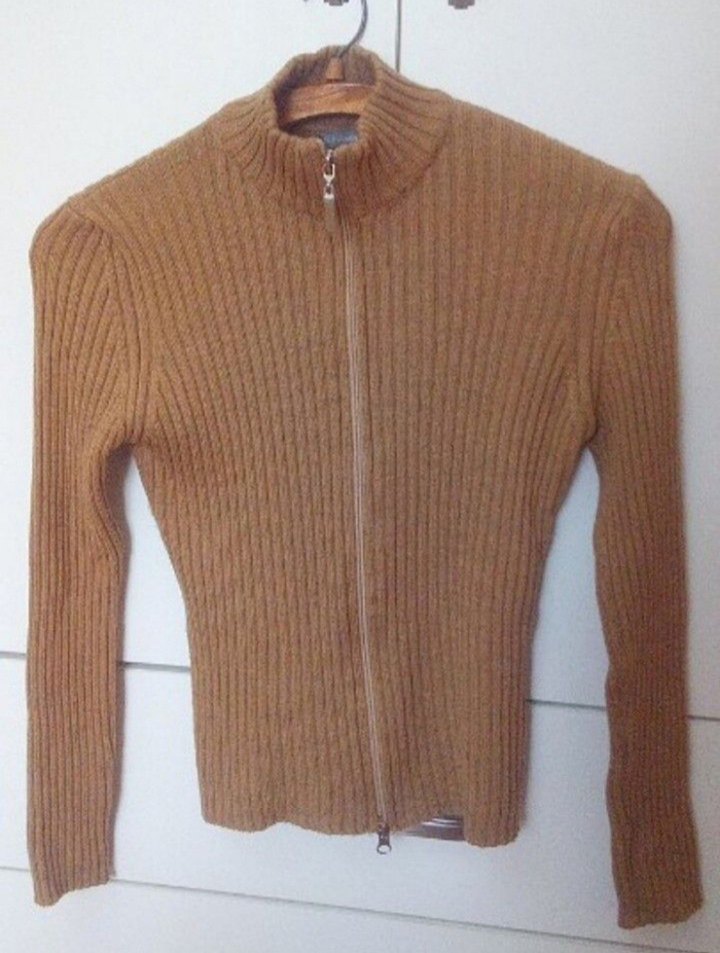 Kahverengi örgü, yün kumaştan, boğazlı, uzun kollu, vücuda oturan, günlük kullanıma uygun rahat bir kadın hırkasıdır.