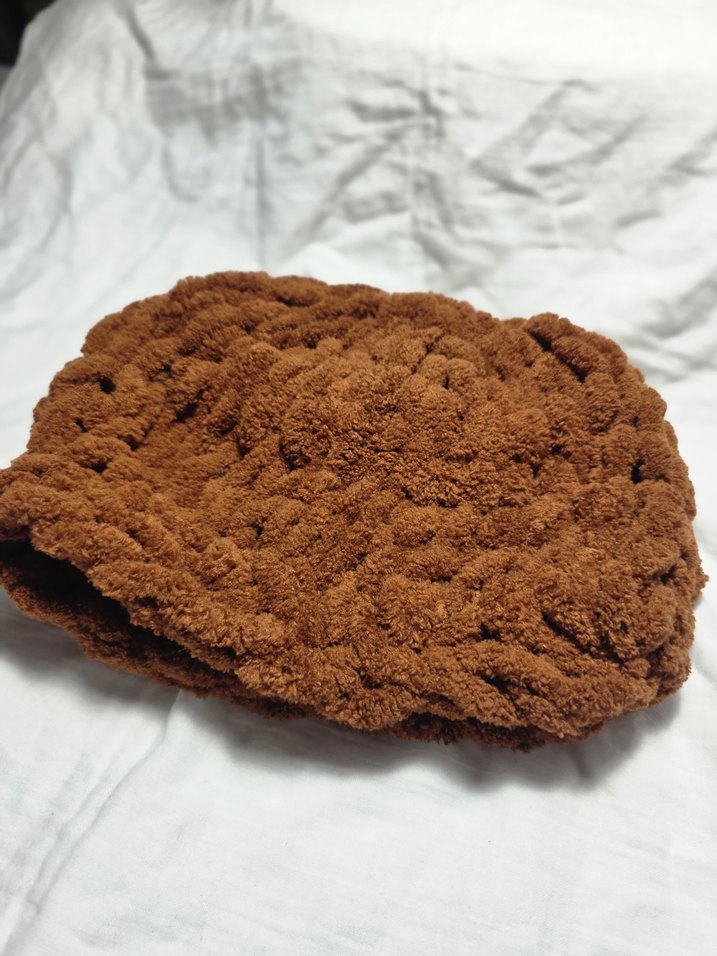 Koyu kahverengi örgü yünden yapılmış, sade ve bohem tarzda rahat bir kadın bere. Soğuk havalar için yumuşak dokulu.