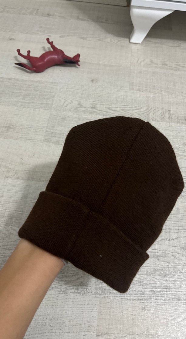 Koyu kahverengi örgü yün bere, sade sokak stiliyle rahat bir kullanım sunar. Temel ve günlük kullanıma uygundur.