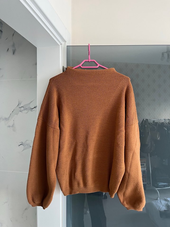 Kahverengi örgü yün kazak, yuvarlak yaka ve uzun kollu, bol kesimdir. Rahat, gündelik sokak stiline uygundur. Midi boyda ve desensizdir.