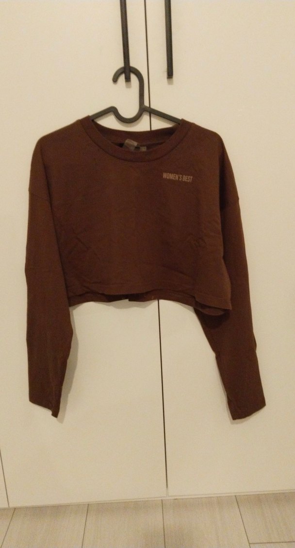 Kahverengi, uzun kollu, yuvarlak yakalı, bol kesim ve kısa boylu kadın sweatshirt. "MOMEN'TREST" yazılı, sade ve rahat günlük stil için uygun.