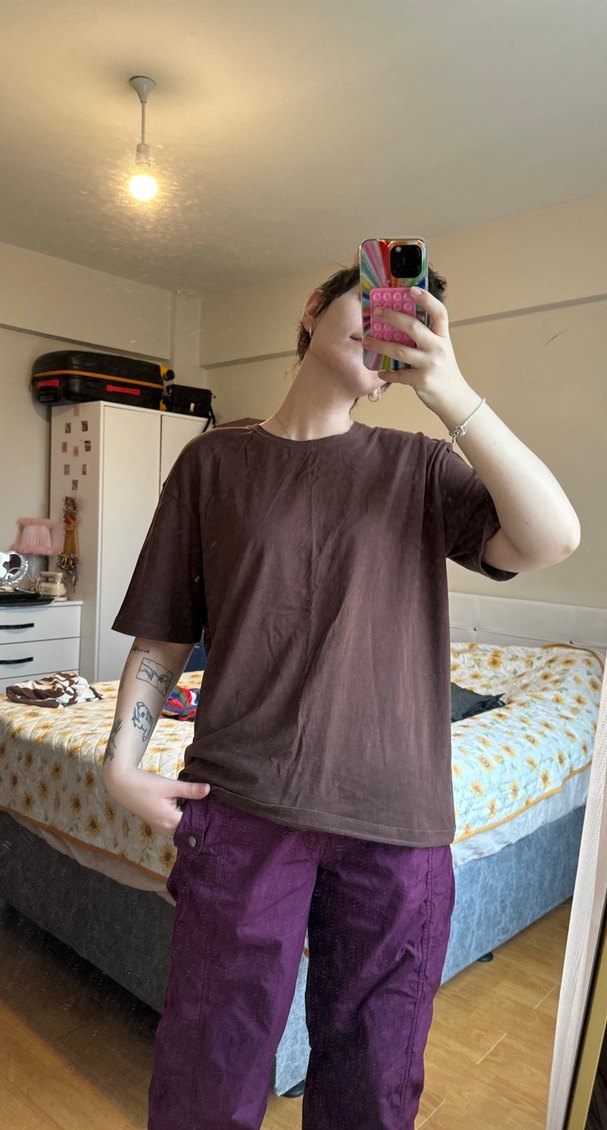 Kahverengi kumaştan, oversize kesim, kısa kollu ve yuvarlak yakalı kadın tişörtü. Günlük rahat ve şık bir görünüm sunar.