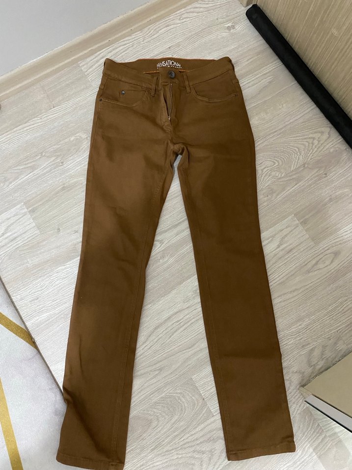 Kahverengi pamuk pantolon, normal boyda ve regular fit kesimde. Günlük kullanım için rahat ve şık, sokak stiline uygun.