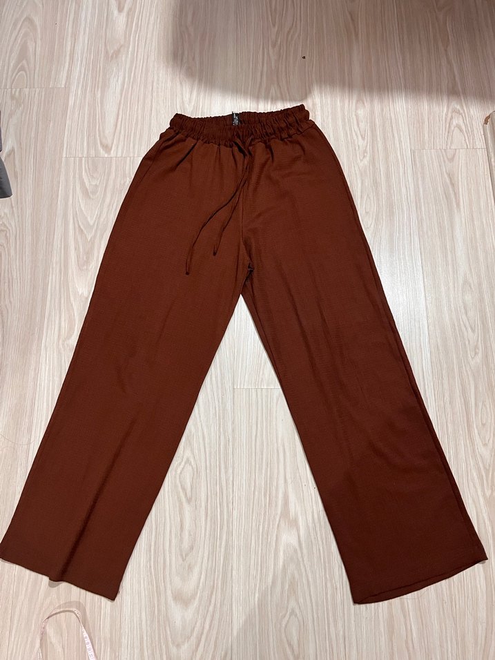 Kahverengi, salaş kesim, midi boy, yumuşak ve parlak kumaştan yapılmış kadın pantolonu. Rahat beli lastikli, günlük rahat ve şık tarz için uygundur.