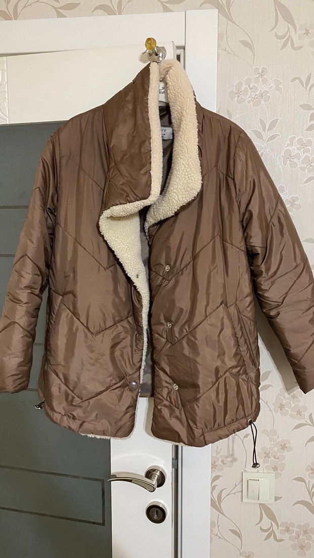 Kahverengi, peluş detaylı, bol kesim, uzun kollu ve normal boyda kadın kışlık ceket. Yumuşak ve sıcak kumaştan, günlük kullanıma uygun. İki koltuk arası 52-53 cm boyu 75 cm