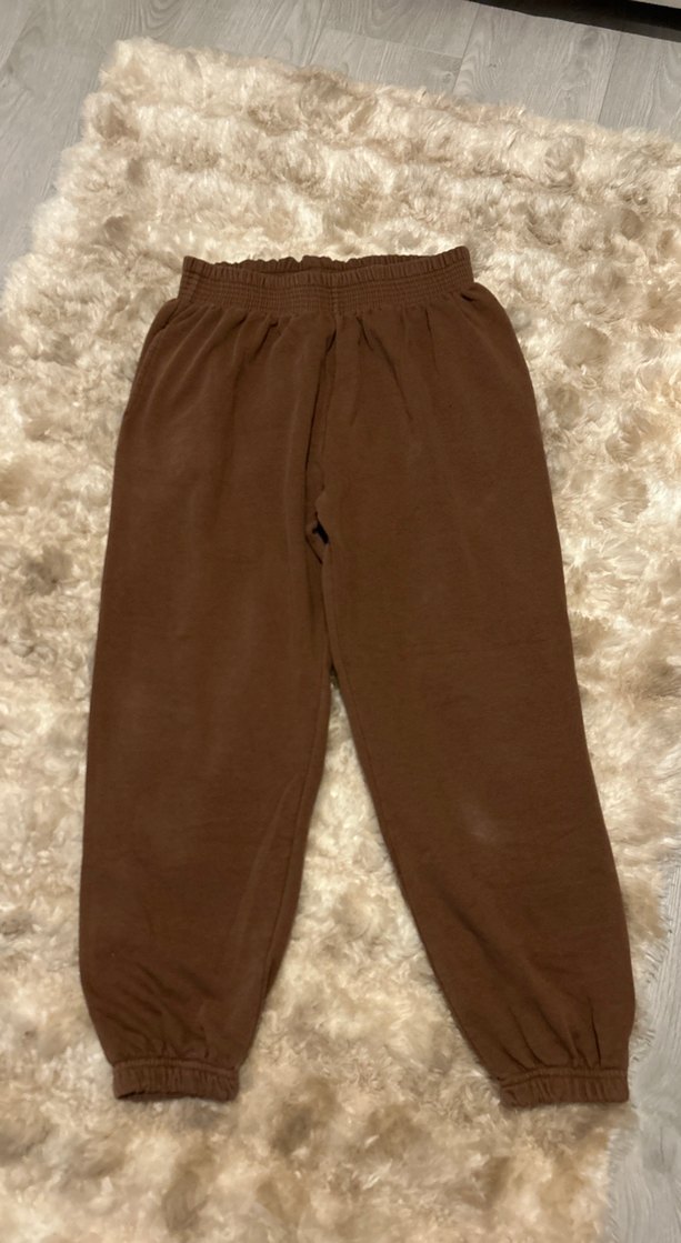 Yumuşak ve sıcak kumaştan, kahverengi, gevşek kesim, kürk detaylı ve lastikli paçalı eşofman altı.