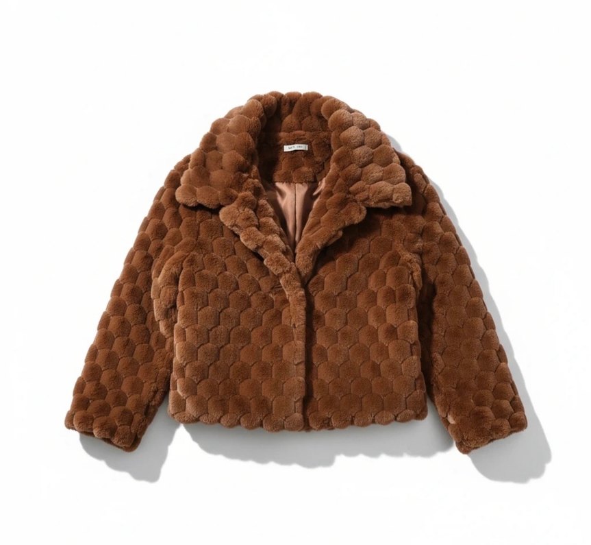 Kahverengi kadın peluş yumuşacık sıcak tutan kaban, yaka detaylı ve uzun kollu. Midi boyda, dokulu yumuşak kumaşıyla rahat ve şık bir parça. Bedenleri mevcuttur