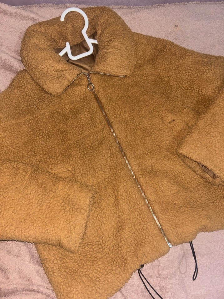 Kahverengi, peluş detaylı, uzun kollu, yakalı ve bol kesim kadın mont. Günlük sokak stili için uygun, midi boyda. ✨