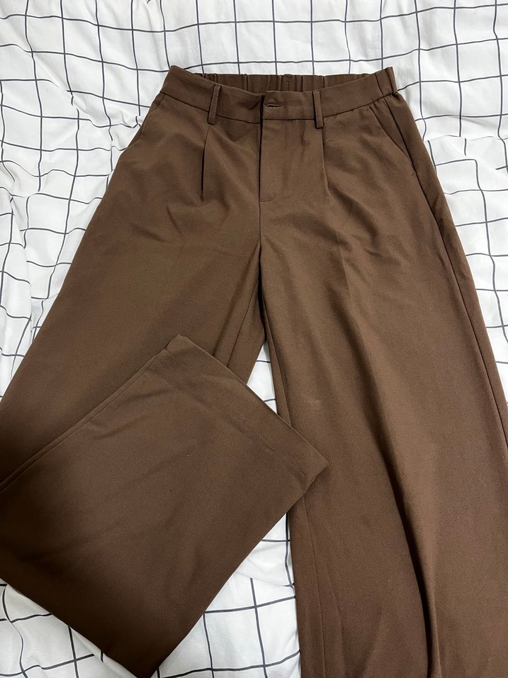 Kahverengi, pilili, regular fit kumaş pantolon. Midi boyda, desen içermeyen, ofis için uygun, minimalist tarzda sentetik kumaştan yapılmıştır.