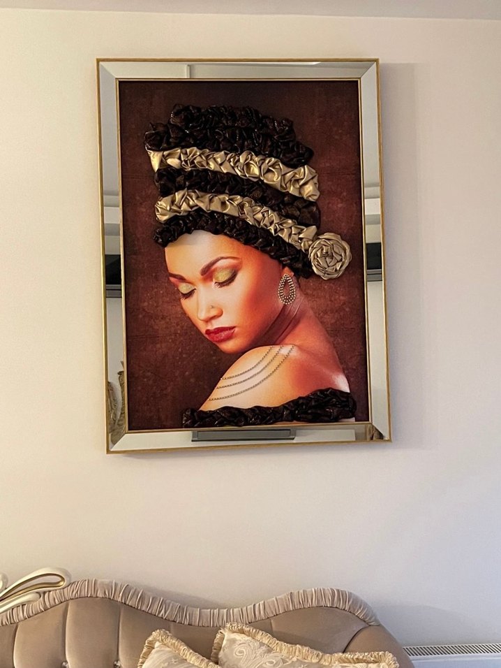Kahverengi tonlarda, başında süslü bir örtü ve küpeler olan kadının portresi. Çerçeveli ve duvarda asılıdır.