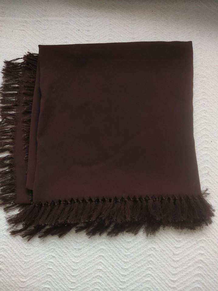 Yumuşak sentetik kumaştan yapılmış koyu kahverengi kadın şalı, kenarlarında rahatlık veren püsküller bulunur. açıklamasi görselde mevcut