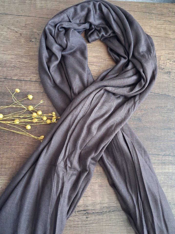 Yumuşak kumaştan, kahverengi renkte, dökümlü tarzda, rahat ve bohem görünümlü kadın şalı. Sade ve temel kombinler için uygundur.