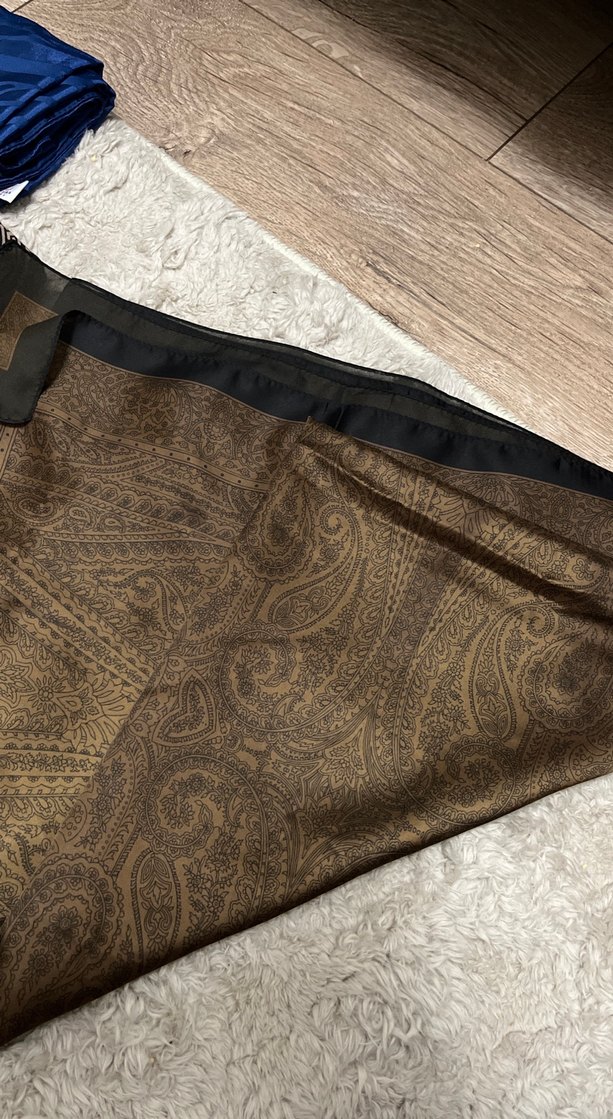 Kahverengi, drapeli, bohem desenli yumuşak sentetik kumaştan kadın şalı. Retro ve hippie tarzına uygundur. Hint ipeğidir