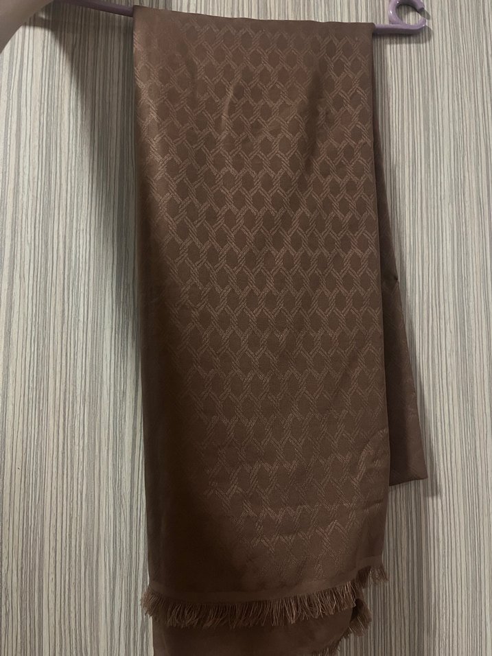 Kahverengi kadın şal, yumuşak sentetik kumaştan, drapeli ve sade bir tarzda tasarlanmıştır. Kenarlarında ince püskül detayları bulunur.