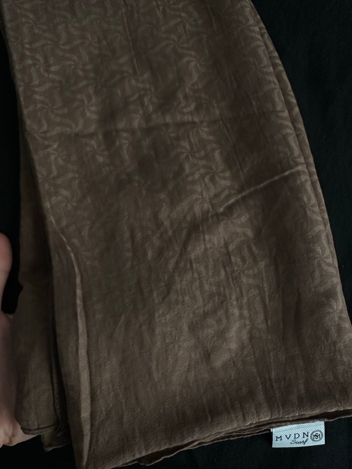 Kahverengi, yumuşak sentetik kumaştan yapılmış, salaş ve drapeli kadın şalı, rahat ve sade bohem tarz sunar.