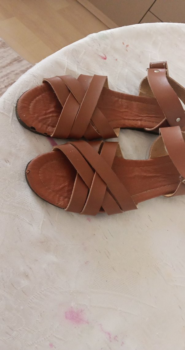 Kahverengi kadın sandalet, tokalı kayışlarıyla minimalist ve rahat bir tasarıma sahiptir. Günlük kullanıma uygundur.