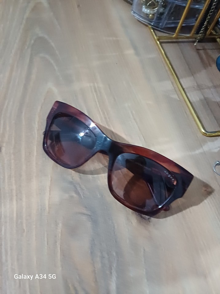 Kahverengi şeffaf kadın güneş gözlüğü, minimalist ve trend günlük tarzda. Koyu tonlar sade ve şık bir görünüm sunar. hafif cizikleri vardir