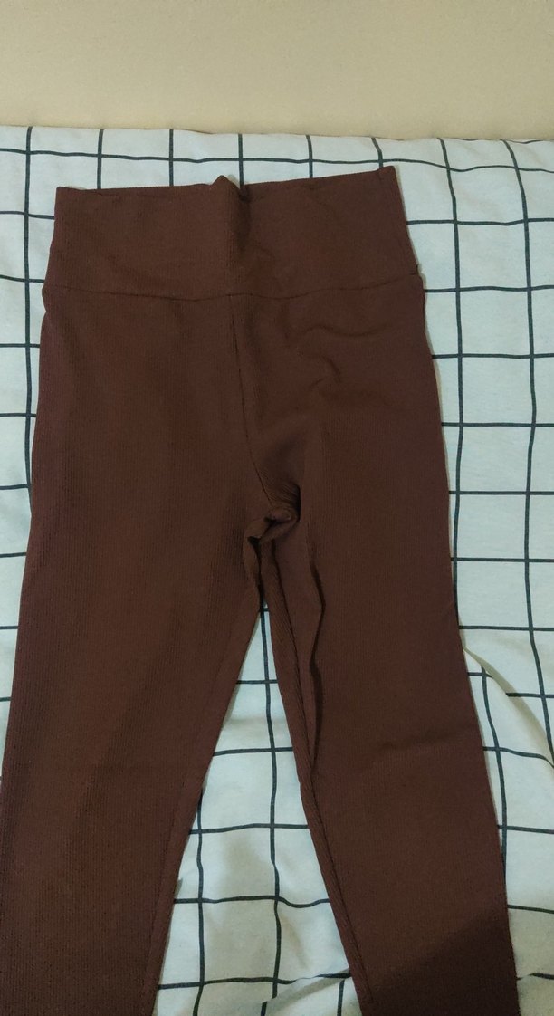 Kahverengi, dar kesim kadın spor tayt, midi boy, pürüzsüz sentetik kumaştan, günlük sokak stili için rahat ve şık görünümlü. ♀️