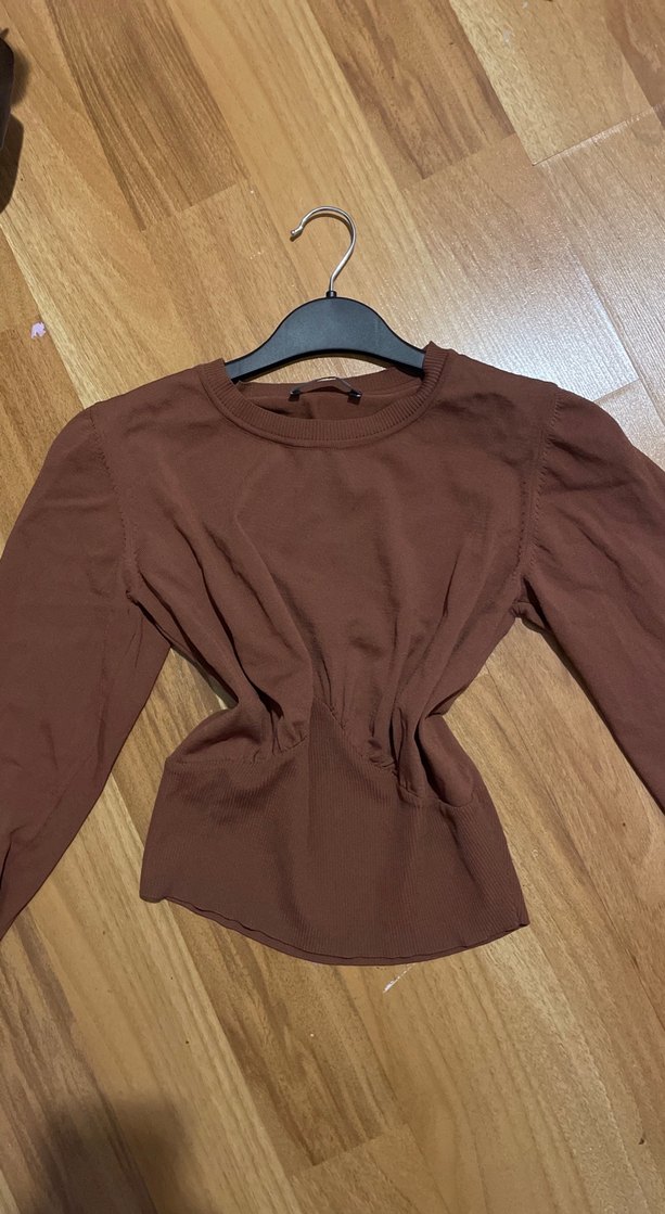 Uzun kollu, yuvarlak yaka ve midi boyda kahverengi kadın süet örme kazak. Rahat ve günlük sokak stili için uygundur. Beli lastikli dar, ütülenmemiş rahat esnek kumaş.