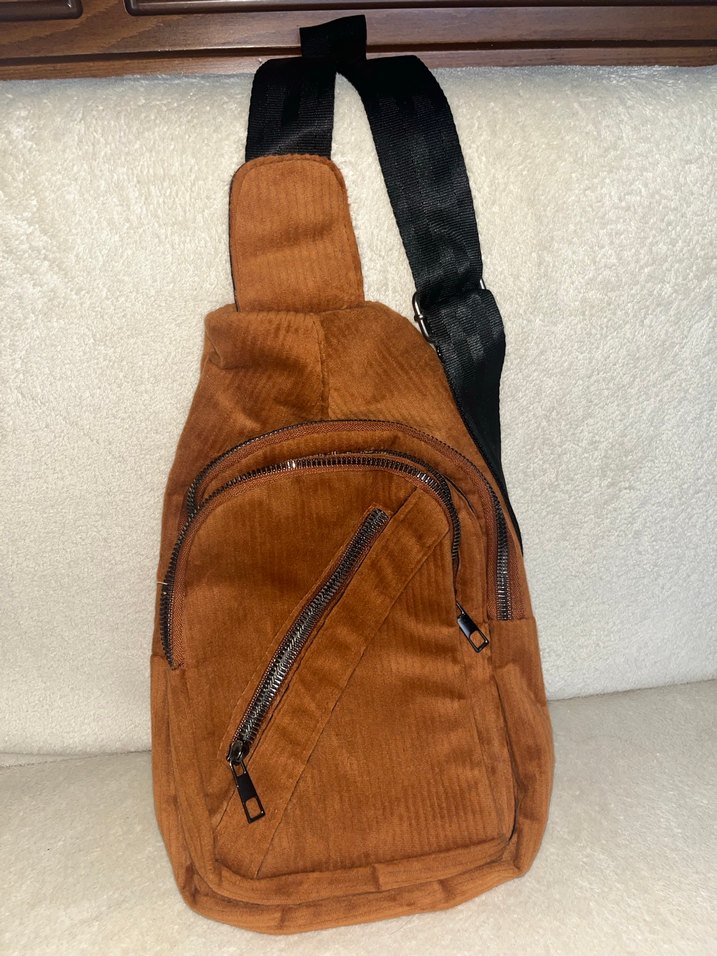 Kahverengi süet çapraz askılı çanta, tokalı detaylar ve çoklu fermuarlı ceplere sahiptir. Günlük kullanıma uygundur