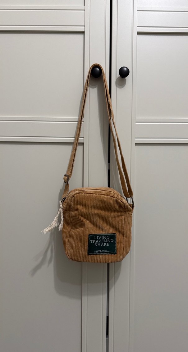 Kahverengi süet malzemeden yapılmış, fermuarlı ve baskılı detaylı çapraz çanta. Günlük kullanım için ayarlanabilir askıya sahip.