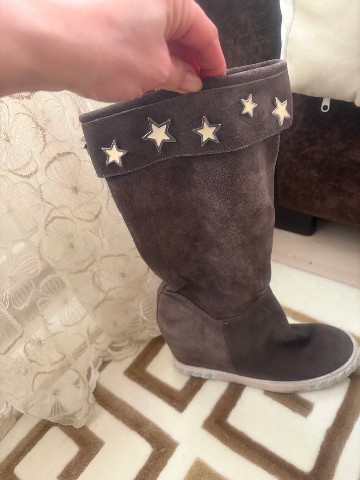Kahverengi süet diz üstü dolgu topuklu çizme, nakış detayları ve kürk süslemeleriyle bohem tarzı ve rahatlığı bir araya getiriyor. ⭐