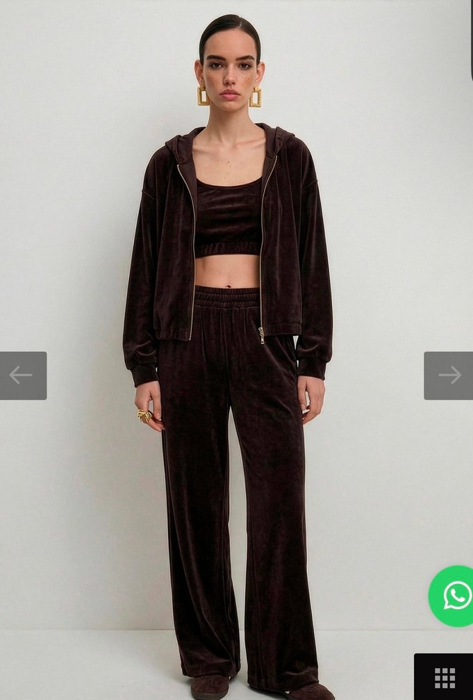 Kahverengi süet kumaştan, bol kesim kadın eşofman takımı. Uzun kollu fermuarlı kapüşonlu üst, V yaka crop top ve midi boy pantolon içerir. Günlük kullanım için rahat ve şık. ♀️