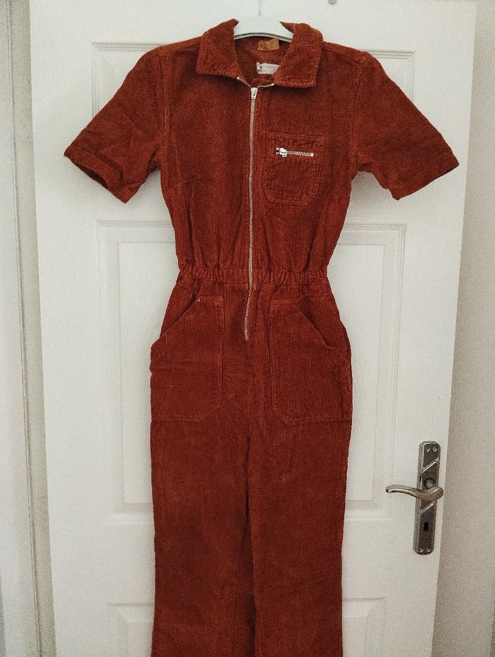 Kahverengi süet kumaştan, kısa kollu ve yakalı, fermuarlı, cepli, rahat ve şık sokak stili tulum. Günlük kullanım için uygundur. iki kol arası 41 cm bel 29 cm basen 44 cm koltukaltından aşağı 128 cm