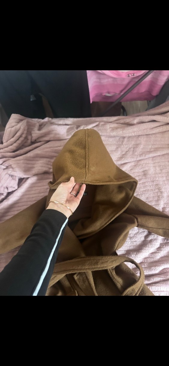 Kahverengi süet kumaştan, yakalı ve drapeli, uzun kollu, midi boy, dar kesim kadın kaban. Trendy ve rahat sokak stili için uygundur.