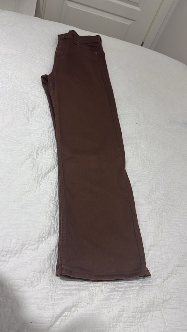 Koyu kahverengi kot kumaştan, regular fit ve tam boy kadın pantolon. Belde kemer detayı bulunur, günlük rahat sokak stili için uygundur.