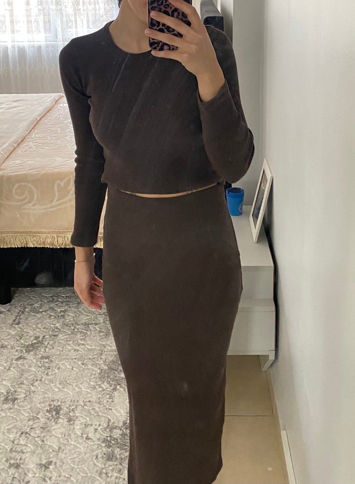 Kahverengi süet kumaştan, uzun kollu ve bisiklet yaka, vücuda oturan midi triko ikili takım. Minimalist tasarımıyla günlük şıklık sunar. ✨