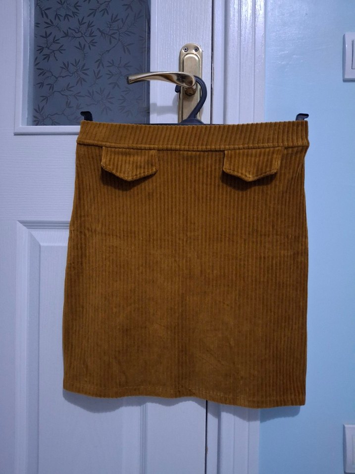 Kahverengi süet kumaştan, pileli ve kapak detaylı, dar kesim kadın mini etek. Günlük sokak stili için uygun, parlak görünümde ve minimalist tarzda.