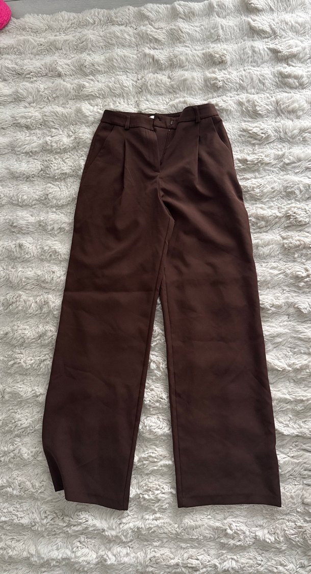 Kahverengi süet kumaştan, normal boy midi kesim, düz ve sade tasarımlı kadın pantolonu. Ofis için ideal minimal ve şık stil sunar.