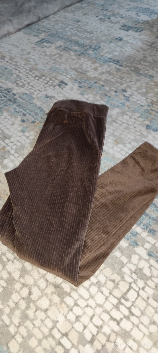 Kahverengi süet, pileli dokulu, midi boy, vücuda oturan kadın taytı. Günlük kullanıma uygundur.