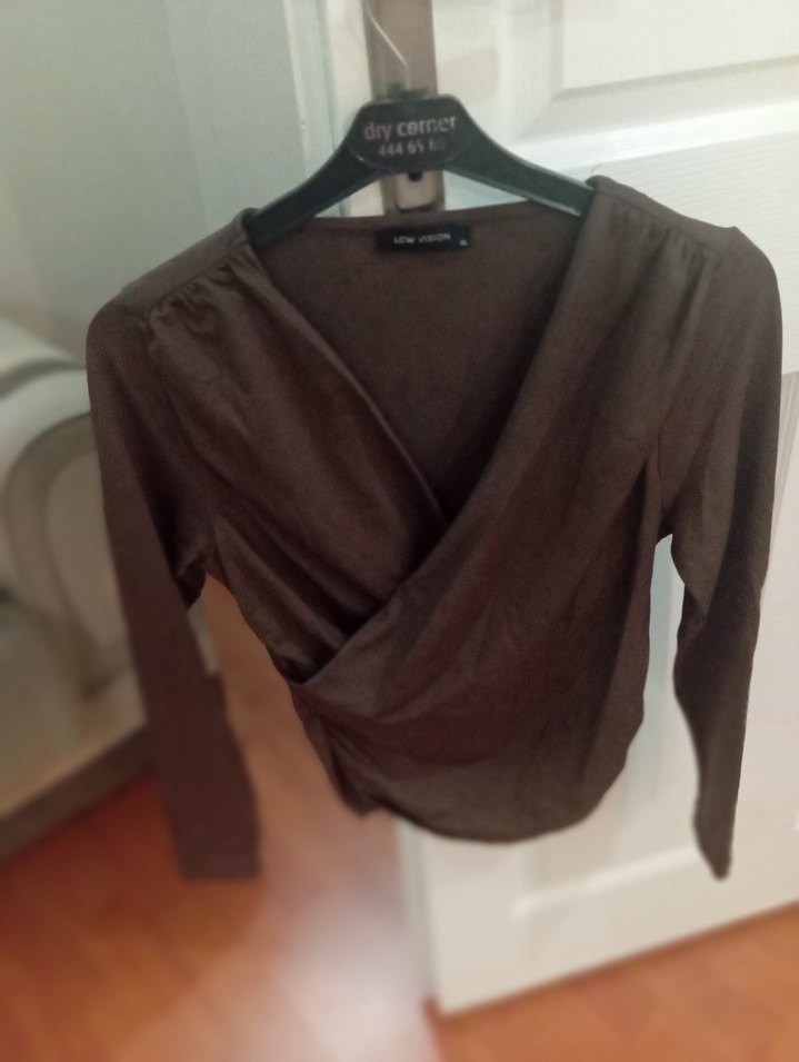 Kahverengi süet malzemeden, uzun kollu ve yuvarlak yaka, drapeli ve salaş kesim kadın bluz. Günlük kullanıma uygun rahat stil.