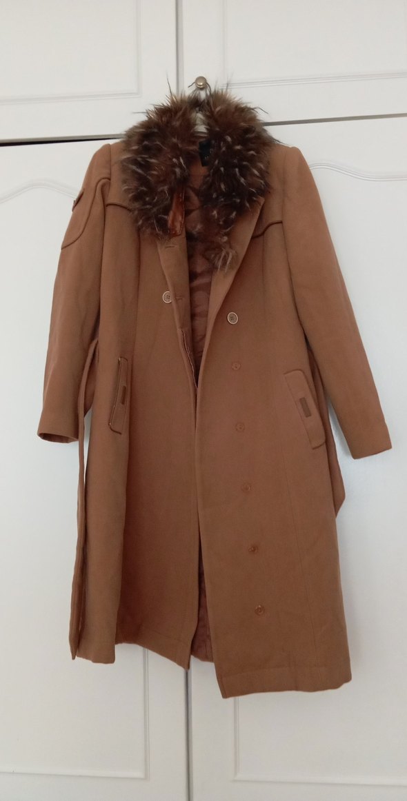 Koyu bej renkte, süet kumaştan yapılmış, uzun ve regular fit kadın kaban. Yakasında kürk detayları ve çentikli yaka bulunur. Ofis kullanımı için uygundur. detaylı fotoğraf çekilmişti başka fotoğraf var mı diye sormayın az kullanıldı minik bir kusuru var o da fotoğraf da belirtilmiştir çokta göze batmıyor uzunluğu 105cm iki koltuk arası 50 cm 65 kiloda giyildi ciddi alıcılar yazsın