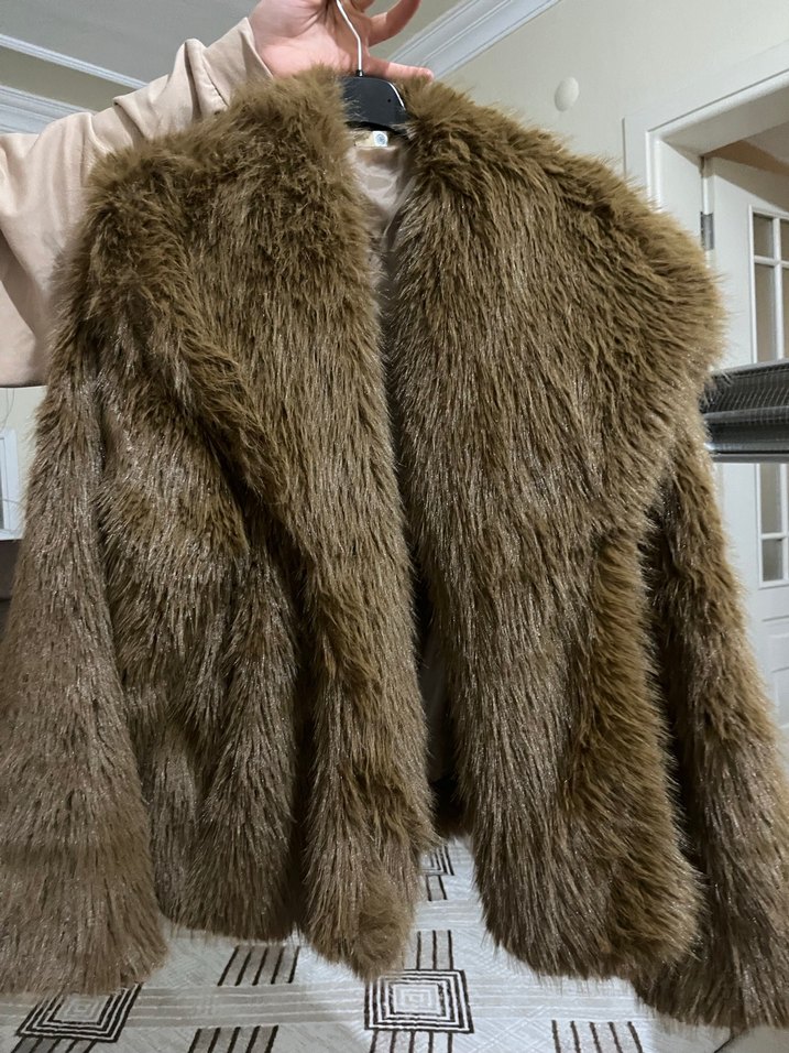 Kahverengi suni kürk ceket, fitted kesim ve yaka detaylıdır. Sentetik kumaştan üretilmiş, uzun kollu ve bohem tarzda günlük kullanıma uygundur.