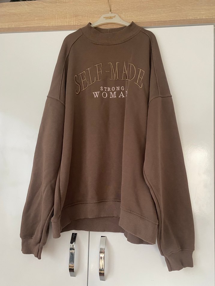 Kahverengi, uzun kollu, bisiklet yaka ve bol kesim sweatshirt. Nakışlı "SELF-MADE STRONG WOMAN" yazısı ve örgü detayları bulunur. Süet dokulu kumaştan, günlük rahat kullanıma uygun.
