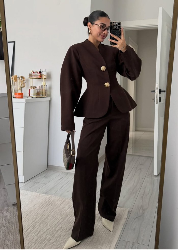 Kahverengi kumaştan, düğmeli ve kesik yaka detaylı kadın takım elbise. Uzun kollu, regular fit ve midi boy ceketiyle ofis için şık ve modern bir tarz sunar.