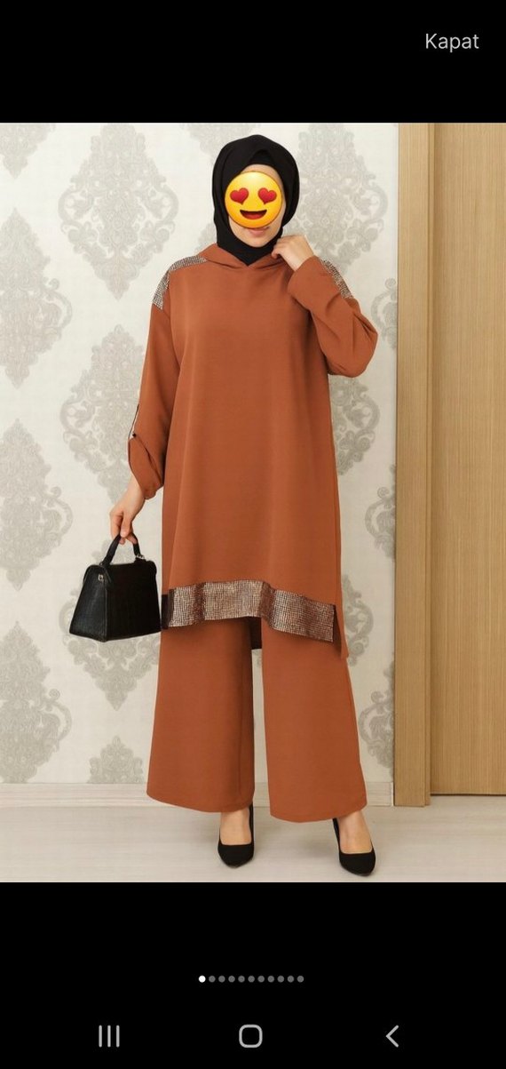 Bol kesim, uzun kahverengi kadın takımı. Uzun kollu, bisiklet yaka ve kemerli, yılan deseni detaylı, kumaştan yapılmıştır. tertemiz sorunsuz kadın ikili takım kapüşonlu pul payet detaylı ister günlük hayatınızda isterseniz düğünlerde özel günlerinizde kullanabilirsiniz pantolonu tuniğe göre bir ton daha koyudur