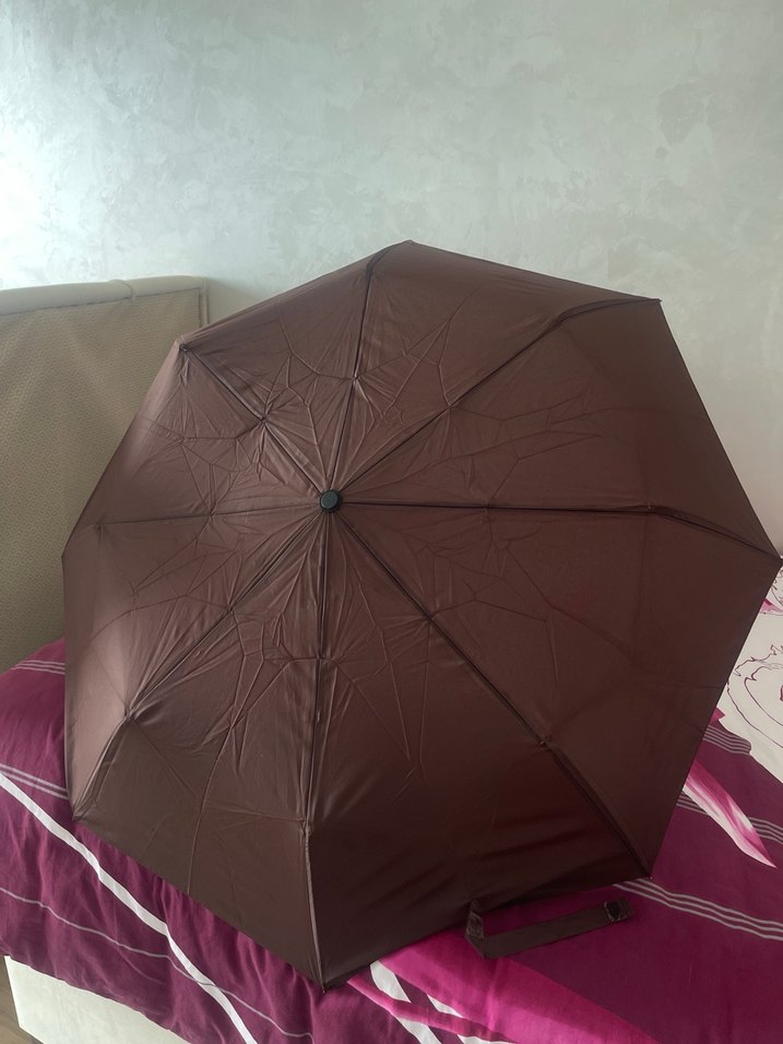 Parizyen gotik stilinden esinlenen, sade ve temel tasarımlı koyu kahverengi pileli şemsiye. ☂️tam otomatik kusurlu olan kısımlar küçük yaptırılır bu haliyle de kullanılabiliyor