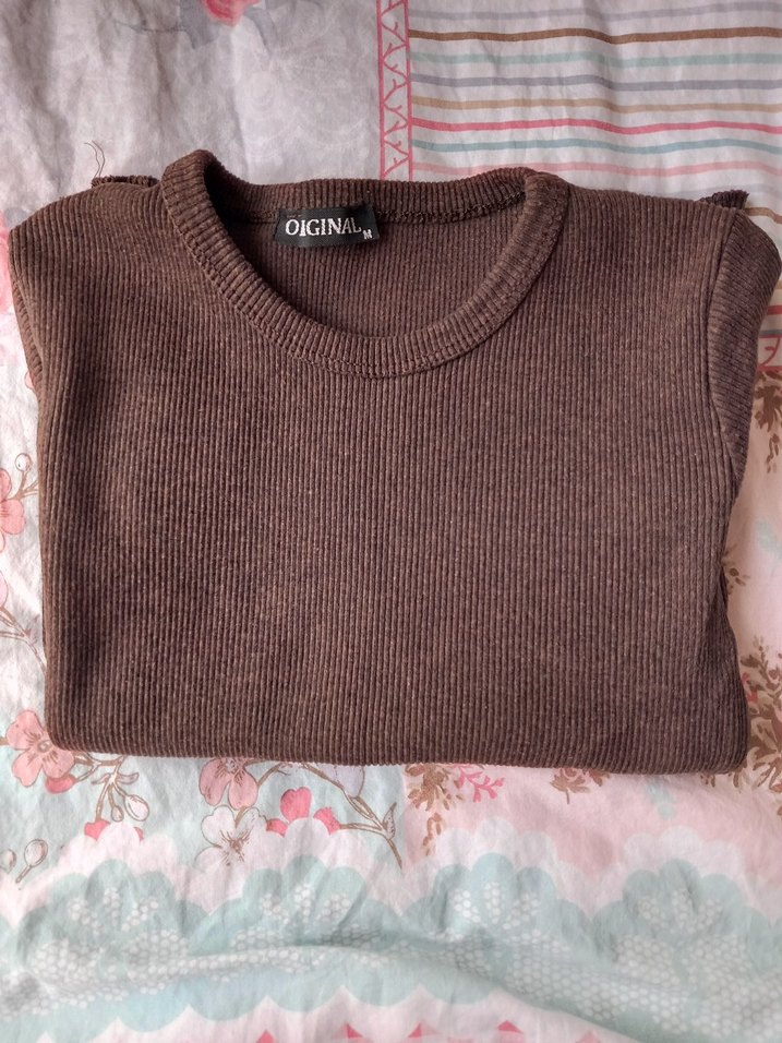 Kahverengi, bisiklet yaka, uzun kollu, vücuda oturan triko kazak. Düz ve rahat tarzıyla günlük kullanıma uygundur.