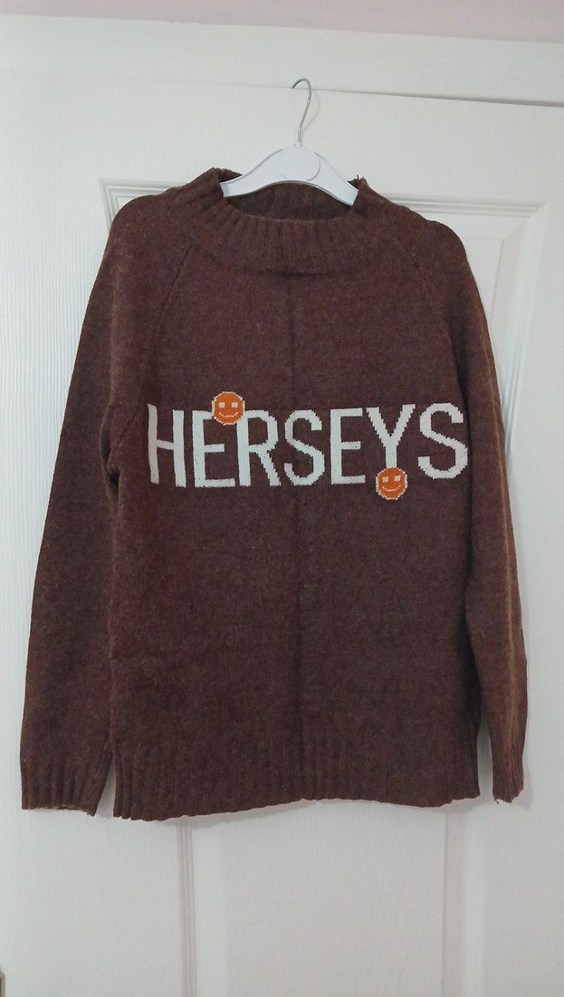 Kahverengi triko, yuvarlak yaka ve uzun kollu, bol kesim ve normal boyda. Önünde "HERSEYS" yazısı ve gülen yüz detayları bulunur, rahat sokak stili için uygundur. sıcak ,kaşindırmaz,yomuşak(44/48 bedene kadar iyi olur)