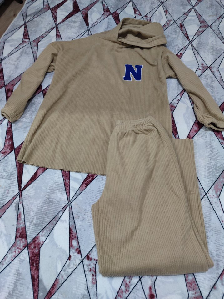 Kadınlar için regular fit, midi boy, uzun kollu, bisiklet yaka, kahverengi tonlarında rahat triko takım.