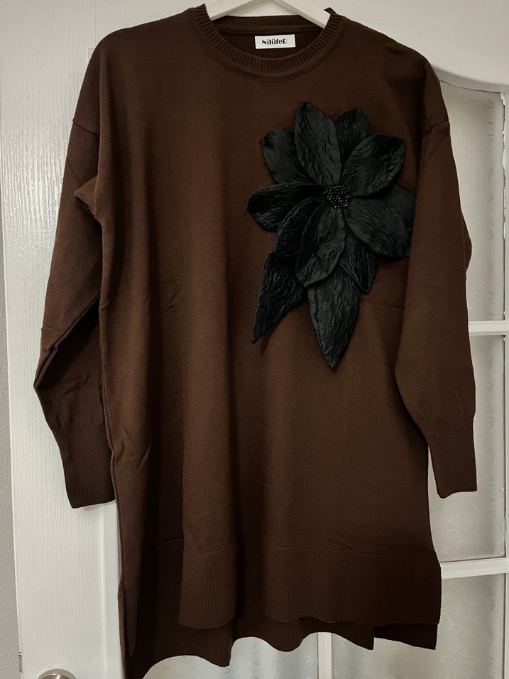 Uzun kahverengi tunik, bol kesim, uzun kollu ve yuvarlak yakalıdır. Sentetik örgü kumaştan yapılmış ve büyük siyah nakışlı çiçek detayıyla günlük kullanıma uygundur. Hiç kullanmadım m l giyen birine rahat uyar