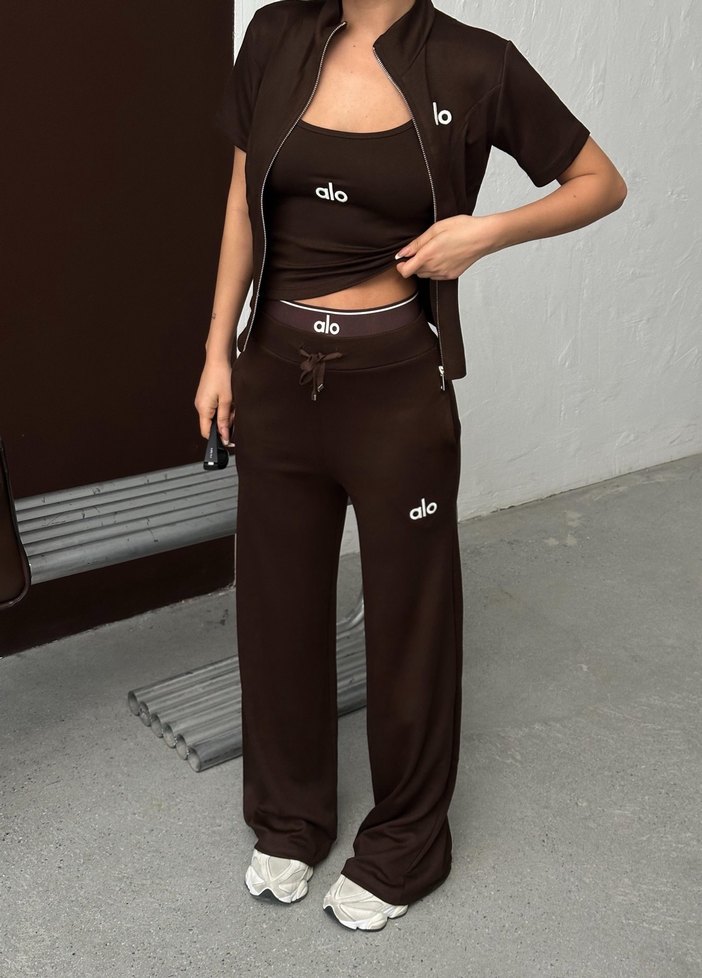 Bol kesim kahverengi kadın üçlü takımı, kısa kollu ceket, bisiklet yaka üst ve bol paça pantolon içerir. 'alo' logosu bulunur. S/M/L bedenleri mevcuttur