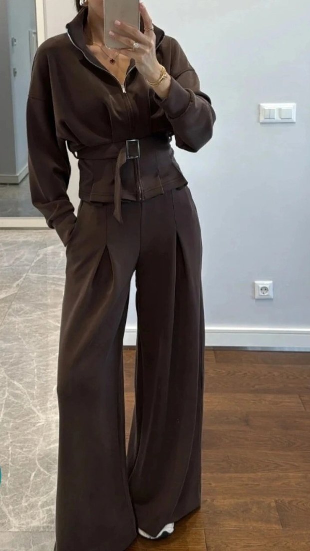 Kahverengi, uzun kollu, kemerli, klasik yaka detaylı kadın takımı. Ofis için uygun, düz dokulu sentetik kumaştan yapılmıştır. siyah bordo bedenler mevcut